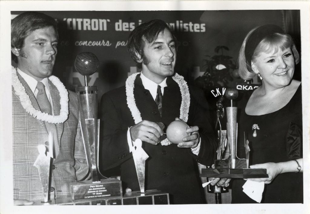 Prix orange à Pierre Lalonde, Yvon Deschamps et Huguette Proulx, 1969, Archives nationales à Québec, Fonds L'Action catholique, (03Q,P428,S3,SS1,D11,P25), Photographe non identifié.