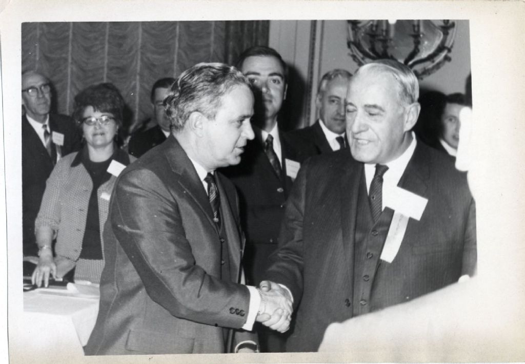 Jean-Jacques Bertrand serrant la main à un congressiste, [Vers 1970], Archives nationales à Québec, Fonds L'Action catholique, (03Q,P428,S3,SS1,D12,P10), Photographe non identifié.