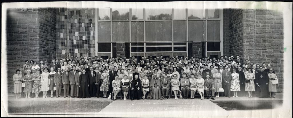 Groupe de personnages devant le collège Notre-Dame à Montréal, 1959, Archives nationales à Québec, Fonds L'Action catholique, (03Q,P428,S3,SS1,D12,P73), Studio Jean.