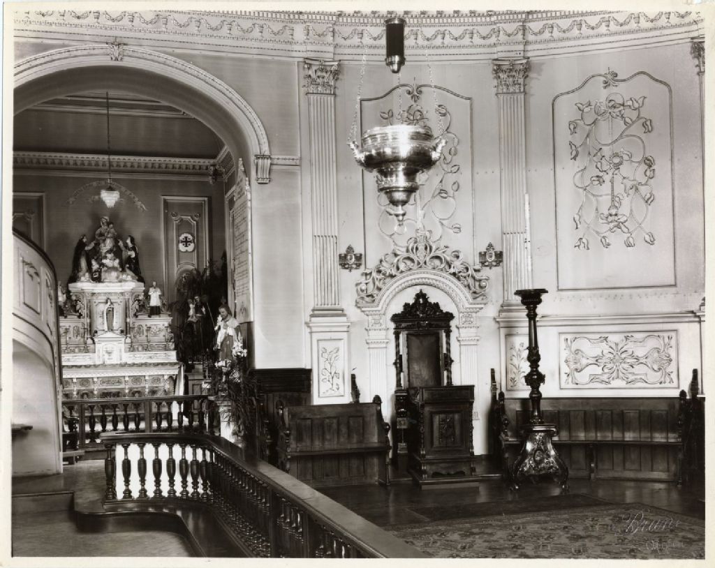 Vue de l'intérieur, la lampe du Sanctuaire, le fauteuil et le chandelier du Cierge Pascal