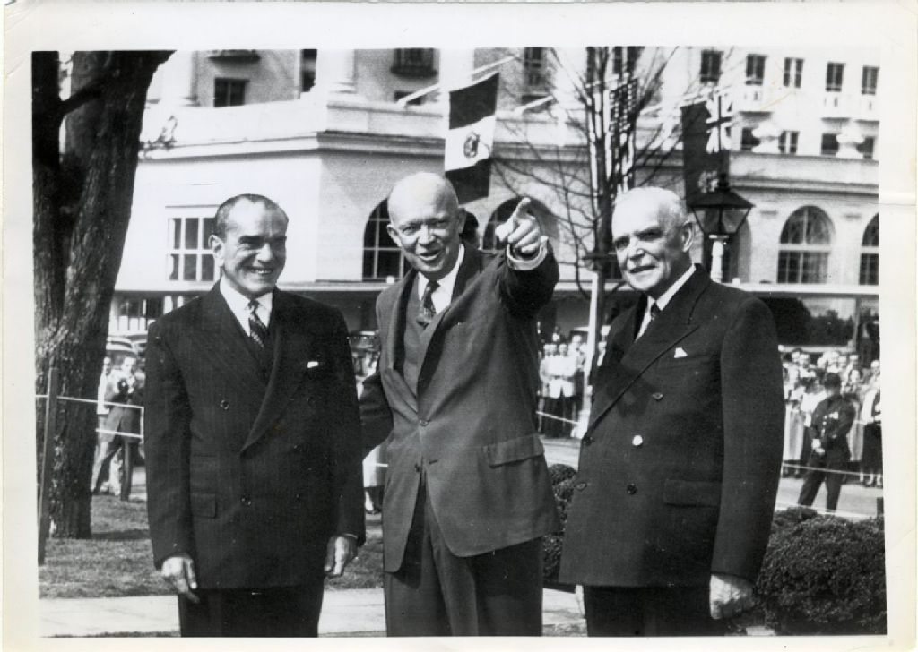Adolfo Ruiz Cortines, Dwight David Eisenhower et Louis St-Laurent à la conférence au sommet des pays nord-américains, mars 1956, Archives nationales à Québec, Fonds L'Action catholique, (03Q,P428,S3,SS1,D16,P102), United Press Telephoto.
