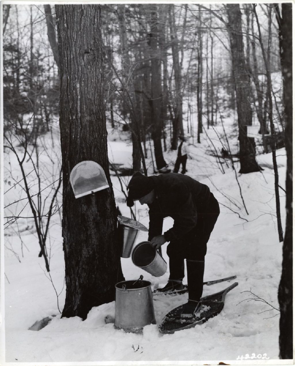 Un homme pendant la collecte de l'eau d'érable, [Vers 1930], Archives nationales à Québec, Fonds L'Action catholique, (03Q,P428,S3,SS1,D19,P37), Canadian National Railways.