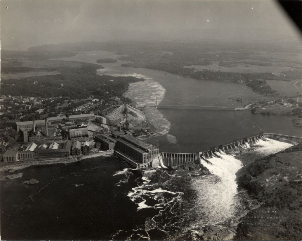 Vue aérienne au-dessus les installations de la "Canada Power & Paper Company", [Vers 1930], Archives nationales à Québec, Fonds L'Action catholique, (03Q,P428,S3,SS1,D29,P41), Interprovincial Airways Limited.