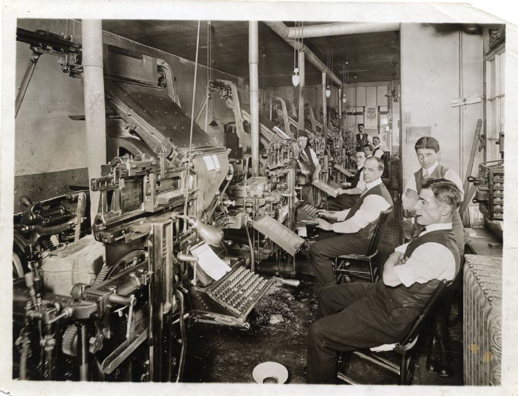 Coin des linotypes, [Vers 1915], Archives nationales à Québec, Fonds L'Action catholique, (03Q,P428,S3,SS1,D2,P6), Photographe non identifié.