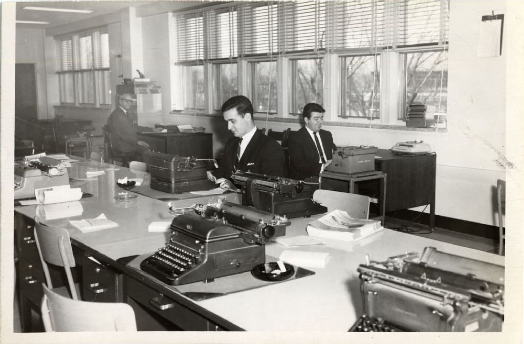 Salle des détectives, Centrale de police, novembre 1966, Archives nationales à Québec, Fonds L'Action catholique, (03Q,P428,S3,SS1,D2,P76), Photographe non identifié.