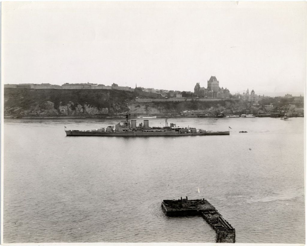 Croiseur de bataille "HMS Hood" à la hauteur du Château Frontenac, [Vers 1925], Archives nationales à Québec, Fonds L'Action catholique, (03Q,P428,S3,SS1,D7,P134), Photographe non identifié.