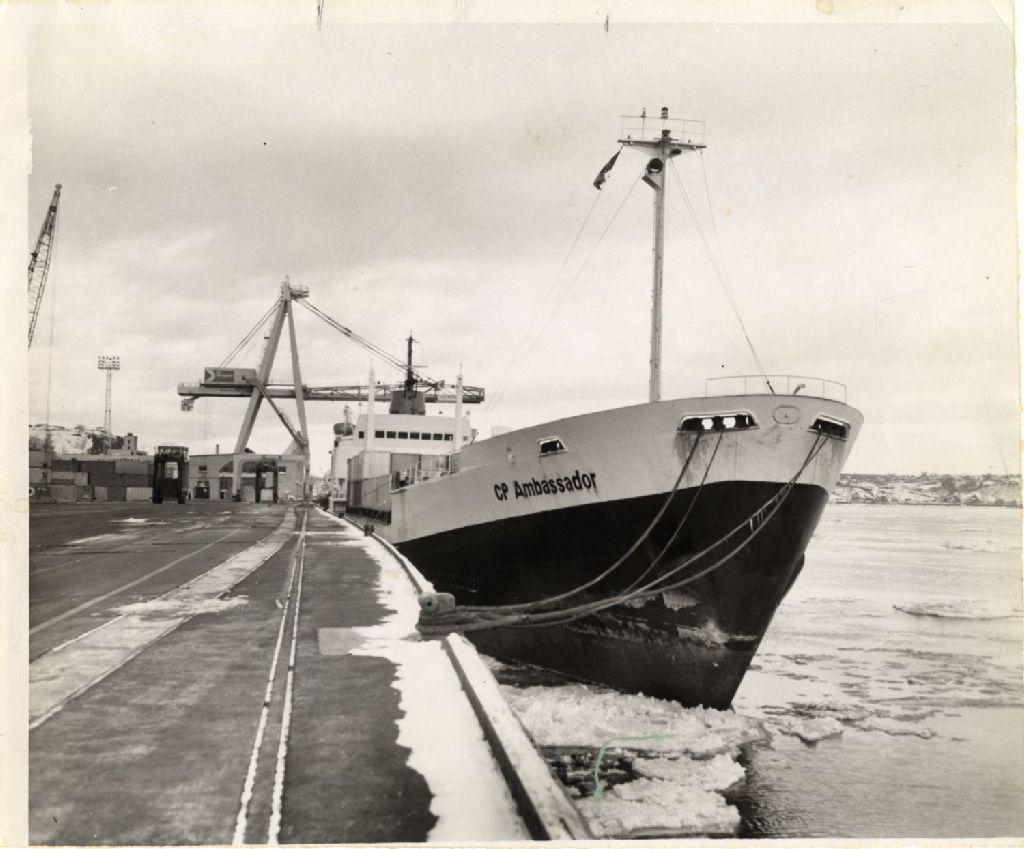 Vraquier "CP Ambassador" au quai de Québec, 1972, Archives nationales à Québec, Fonds L'Action catholique, (03Q,P428,S3,SS1,D7,P34), Photographe non identifié.