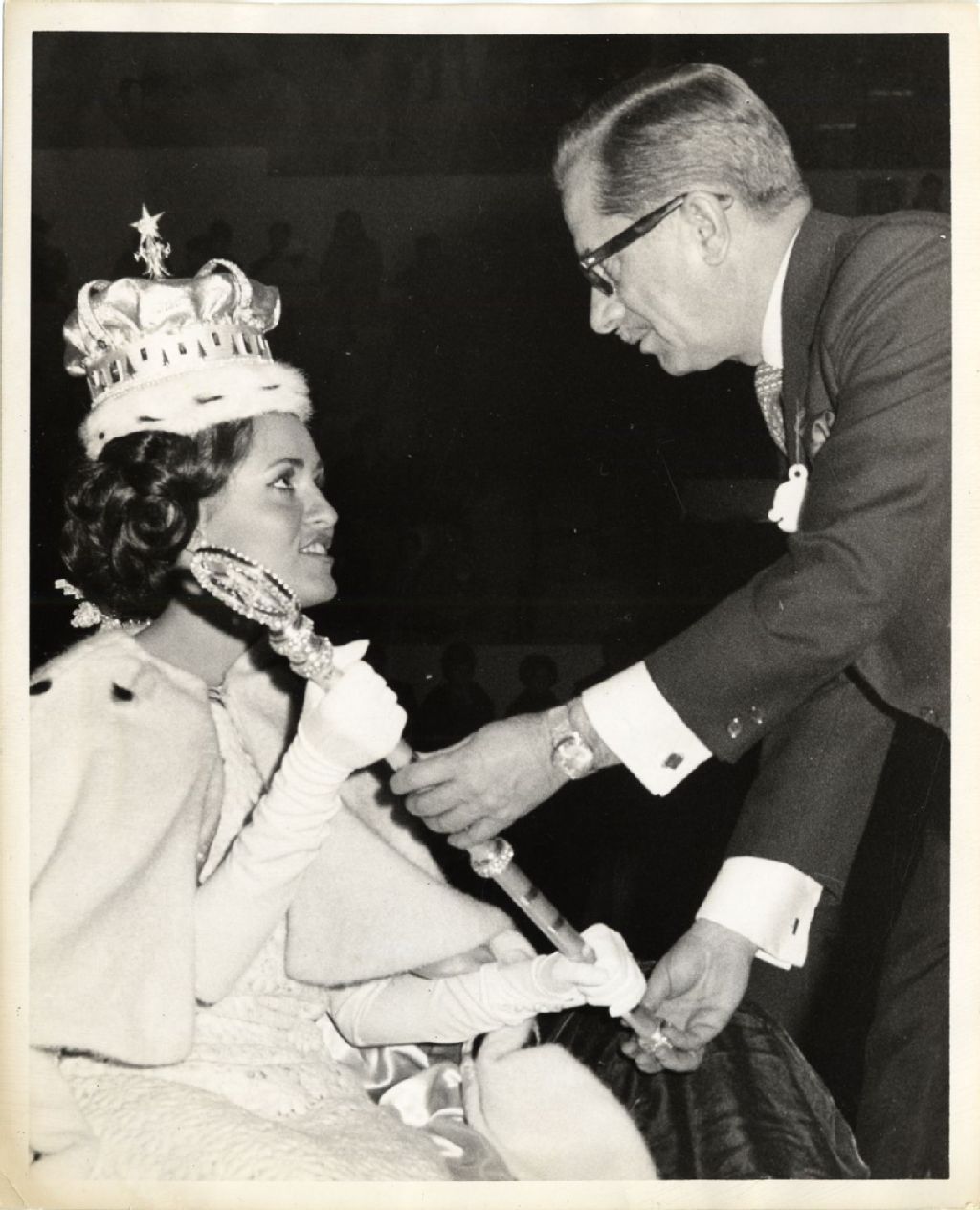 Le premier ministre Daniel Johnson remettant le sceptre à la reine Gaëtane, duchesse de Frontenac, 1967, Archives nationales à Québec, Fonds L'Action catholique, (03Q,P428,S3,SS1,D8,P3), Marcel Laforce / l'Action.