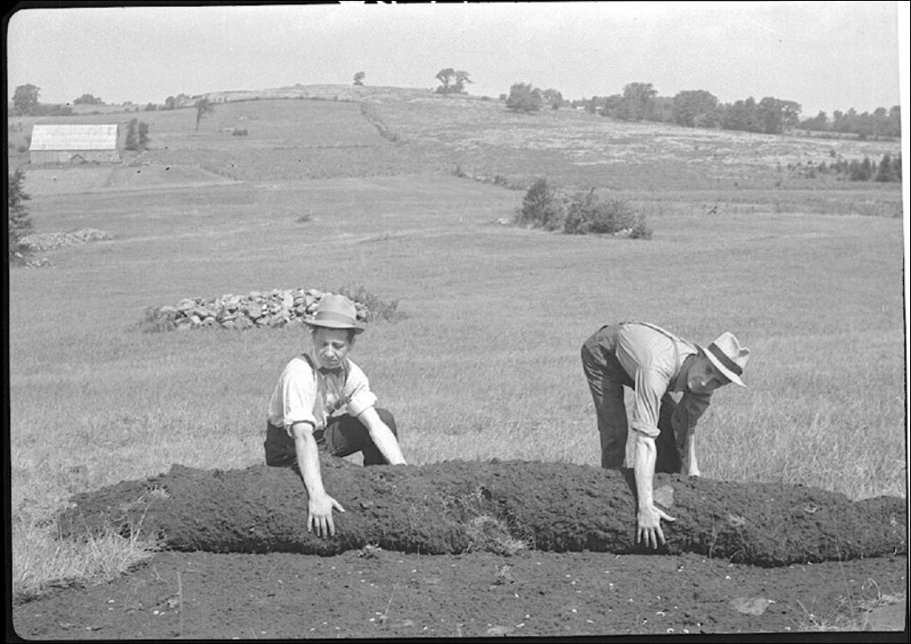 Hannetons dans un tapis roulé de gazon à Granby, 1938, Archives nationales à Québec, Fonds Ministère de la Culture et des Communications, (03Q,E6,S7,SS1,D2,P10483), Paul Carpentier.