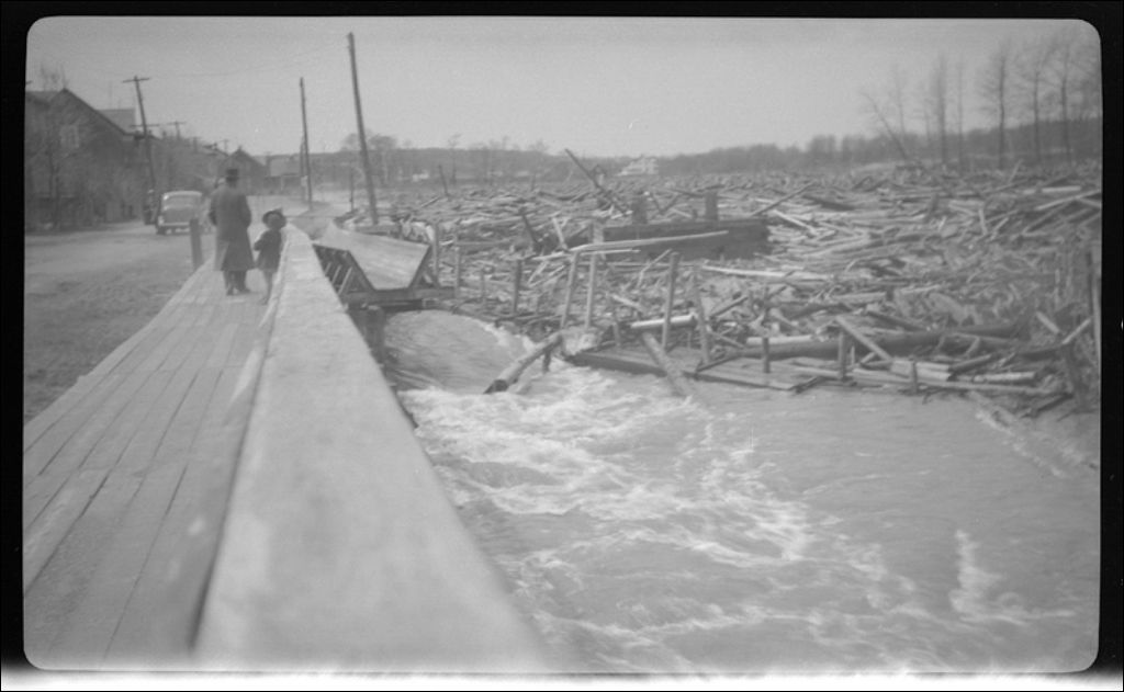 Entassement de bois sur la rivière Matane, 1943, Archives nationales à Québec, Fonds Ministère de la Culture et des Communications, (03Q,E6,S7,SS1,D2,P11695), A.-Euclide Paré.