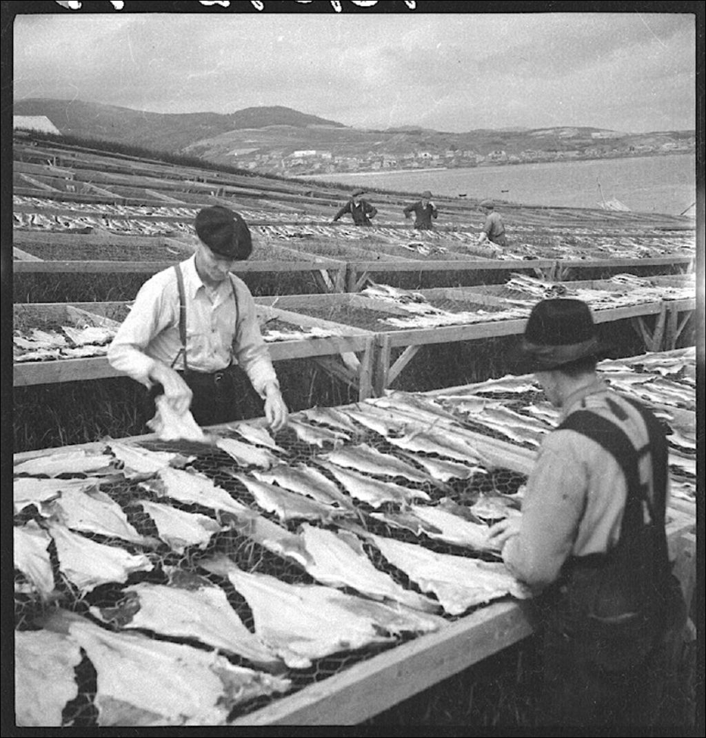 Pêcheurs travaillant au séchage des morues en Gaspésie