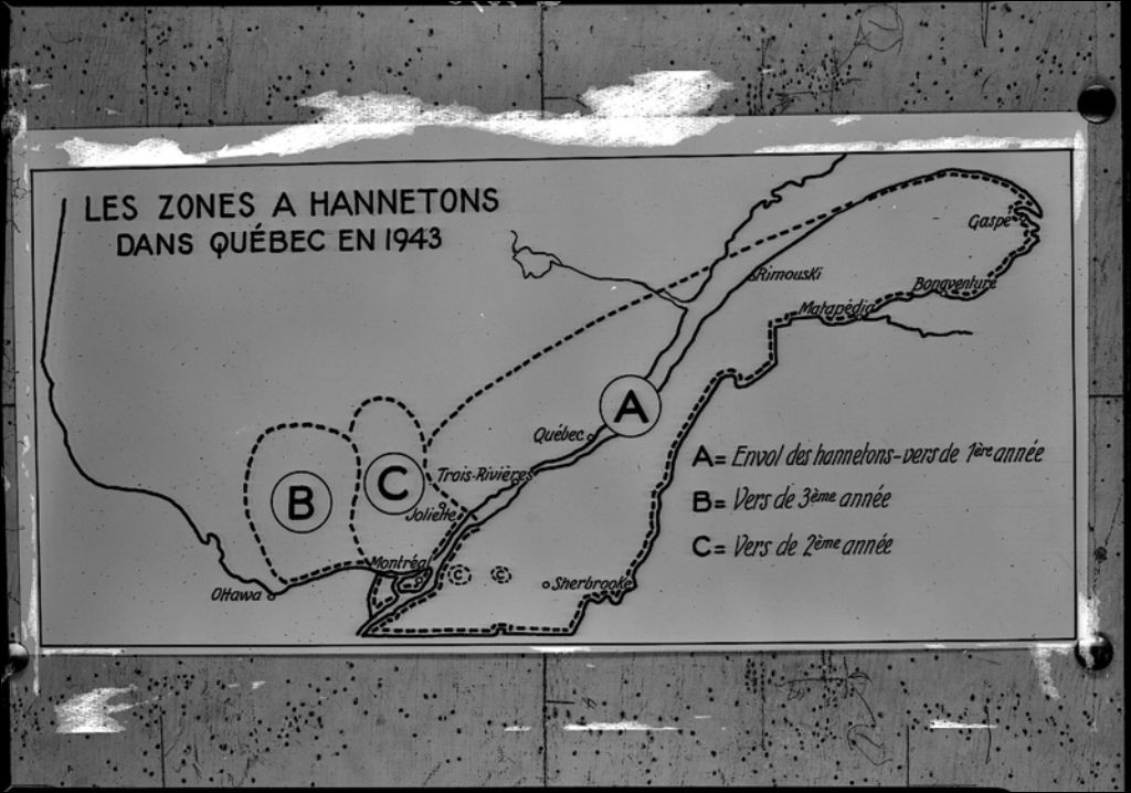 Les zones à Hannetons au QUébec, panneau explicatif, 1943, Archives nationales à Québec, Fonds Ministère de la Culture et des Communications, (03Q,E6,S7,SS1,D2,P1370), Neuville Bazin.
