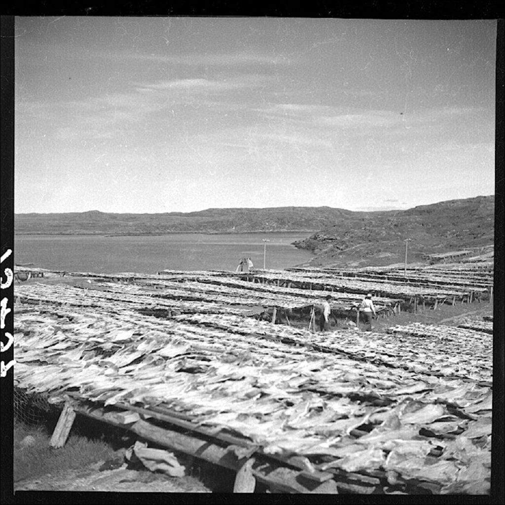 Séchage de la morue sur des vignots chez M. Geo. Whiteley à Bonne-Espérance, 1943, Archives nationales à Québec, Fonds Ministère de la Culture et des Communications, (03Q,E6,S7,SS1,D2,P15437), Vadim Dimitrovicht Vladykov.