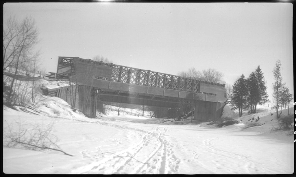 Pont sur la rivière aux Saumons à Notre-Dame-de-Bon-Secours, comté de Papineau, 1944, Archives nationales à Québec, Fonds Ministère de la Culture et des Communications, (03Q,E6,S7,SS1,D2,P17237), Louis-Philippe Poudrier.