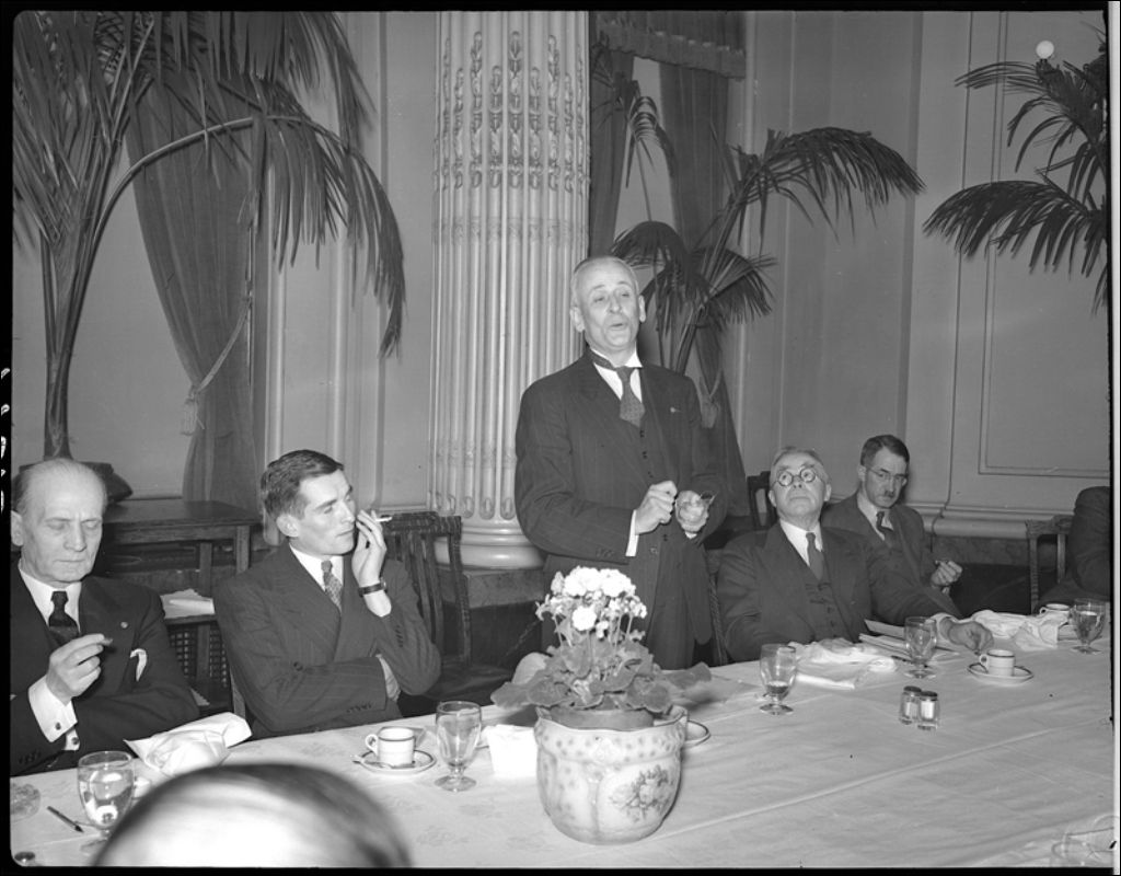 Réunion des officiers du département de l'Instruction publique au Parlement de Québec. Le conférencier J.B. Dufour, professeur à l'école normale Ste-Marguerite-Bourgeoys, Sherbrooke, 1944, Archives nationales à Québec, Fonds Ministère de la Culture et des Communications, (03Q,E6,S7,SS1,D2,P17315), Neuville Bazin.