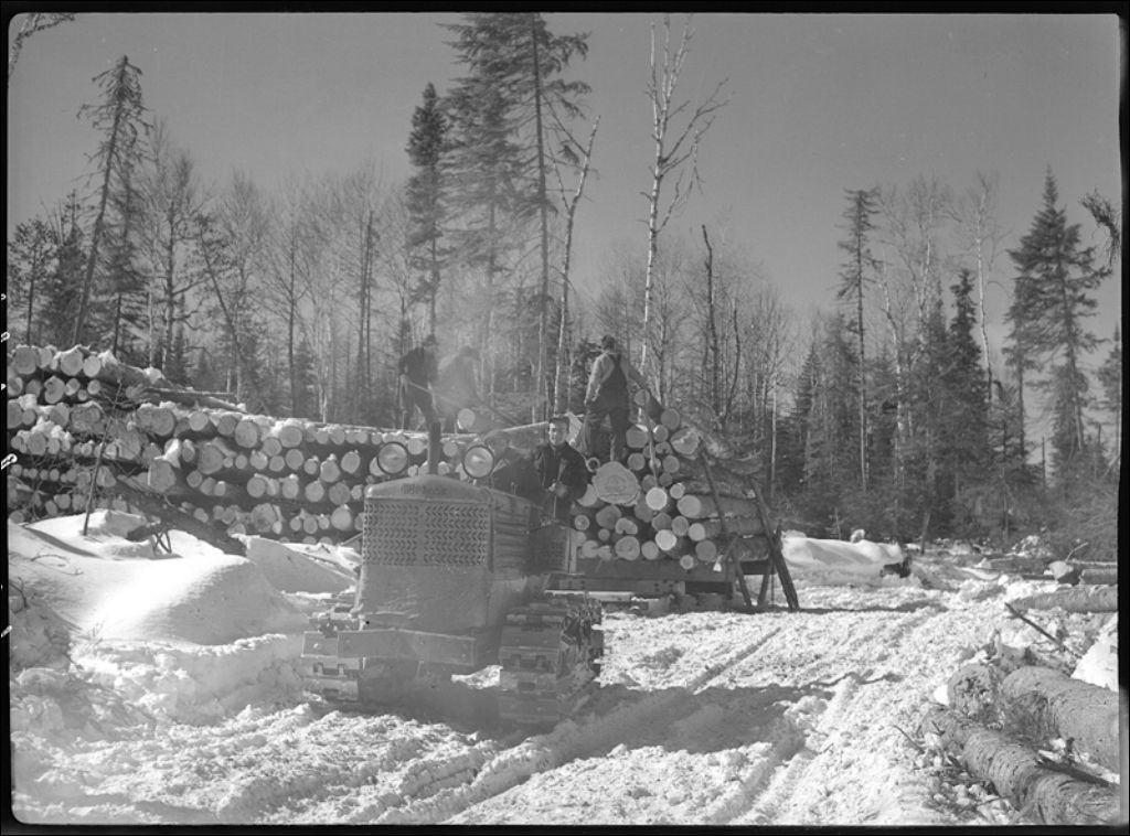 La compagnie Durette et Guérette, entreprise forestière: Transport par des tracteurs à Escourt, 1944, Archives nationales à Québec, Fonds Ministère de la Culture et des Communications, (03Q,E6,S7,SS1,D2,P17409), W. Michaud.