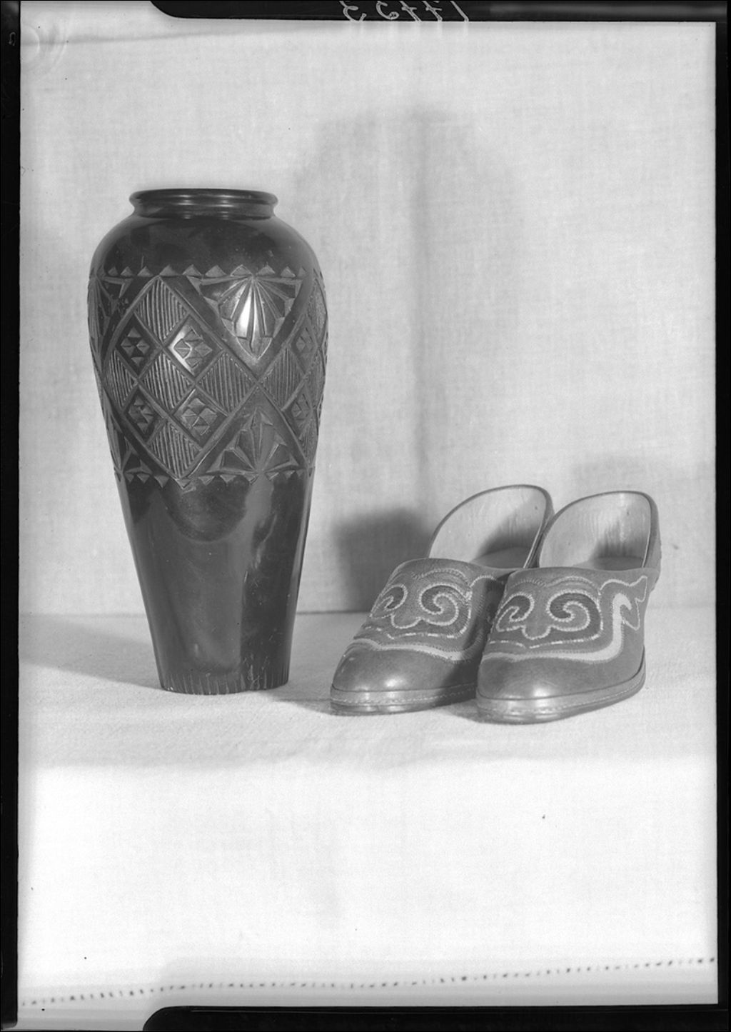 Sculpture sur bois et souliers en cuir provenant de Russie, 1944, Archives nationales à Québec, Fonds Ministère de la Culture et des Communications, (03Q,E6,S7,SS1,D2,P17753), Neuville Bazin.