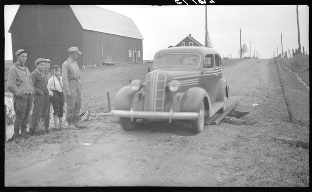 Road washed out by rain, Dupuis township, Abitibi, 1944, Archives nationales à Québec, Fonds Ministère de la Culture et des Communications, (03Q,E6,S7,SS1,D2,P20193), M. Lafontaine.