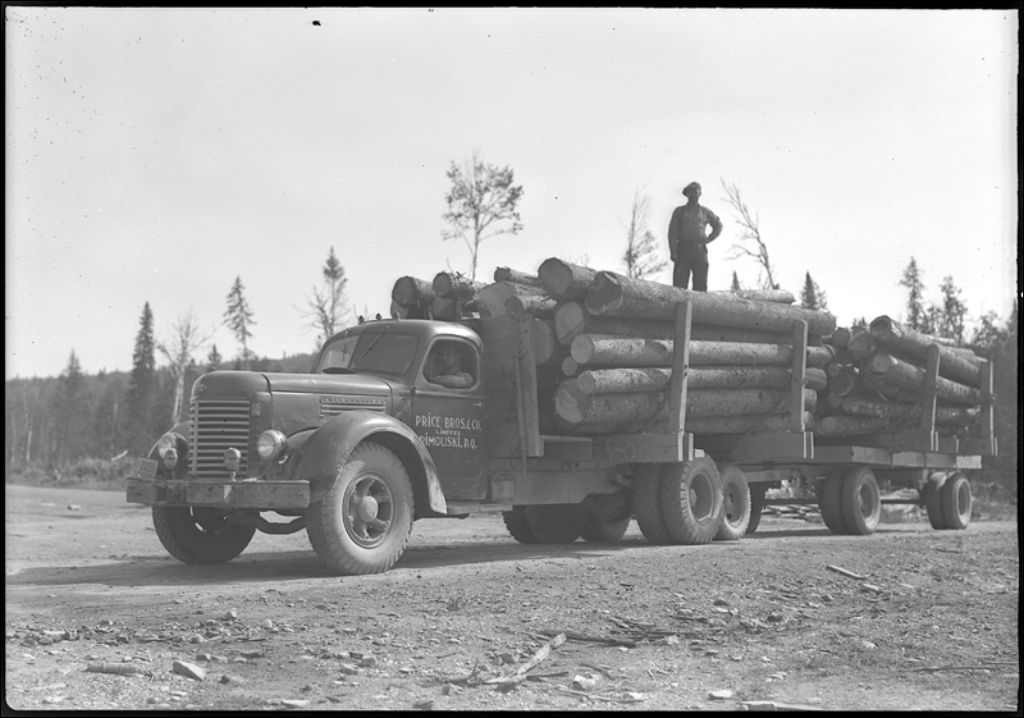Camions et remorques chargés de billots, comté de Rimouski, 1944, Archives nationales à Québec, Fonds Ministère de la Culture et des Communications, (03Q,E6,S7,SS1,D2,P22172), J.W. Michaud.