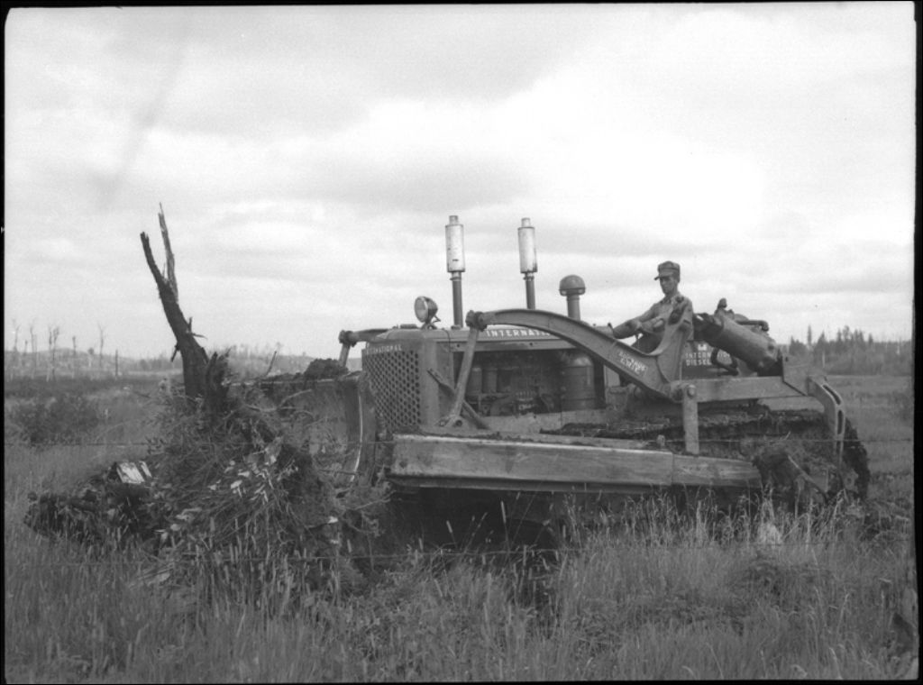 Essouchement sur le lot de Robert Mayrand, conducteur Cyrial Lacroix à Duparquet, Abitibi, 1941, Archives nationales à Québec, Fonds Ministère de la Culture et des Communications, (03Q,E6,S7,SS1,D2,P2326), Donat C. Noiseux.