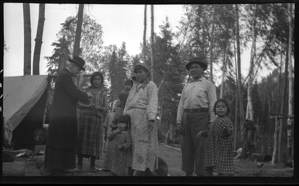 Groupe de Micmacs campés sur la rivière Ottawa, le long du chemin Mont Laurier Senneterre. Ici, le chef et ses deux femmes reçoivent des médailles de M. l'Abbé Alary
