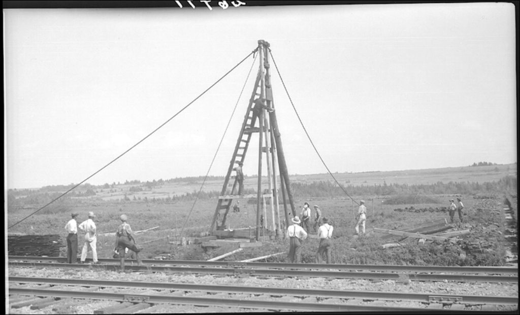 Tourbière de Cacouna, début des opérations pour la construction d'usage, pose des pilotis, 1945, Archives nationales à Québec, Fonds Ministère de la Culture et des Communications, (03Q,E6,S7,SS1,D2,P26791), Henri Girard.
