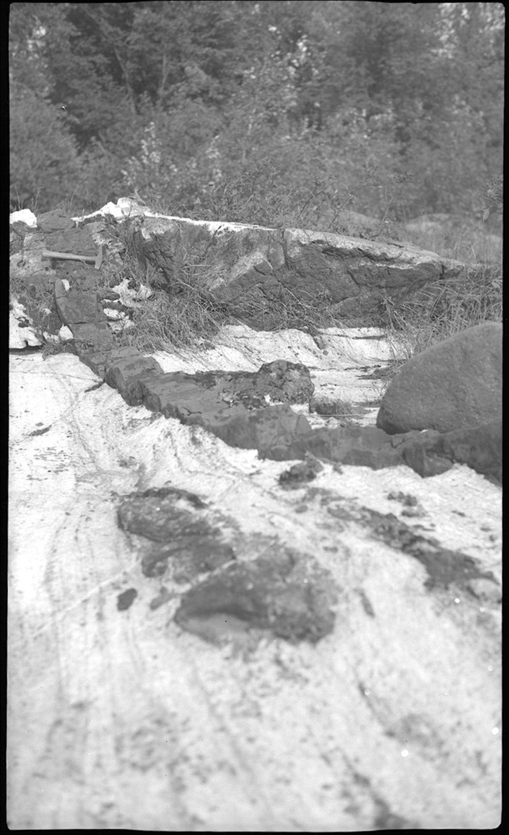 Filon de roche balsatique recoupant les calcaires de Grenville. Rive droite de la rivière Gatineau au Rapide des Six, en amont de Bouchette, lot 26, rang 1 du canton de Bouchette