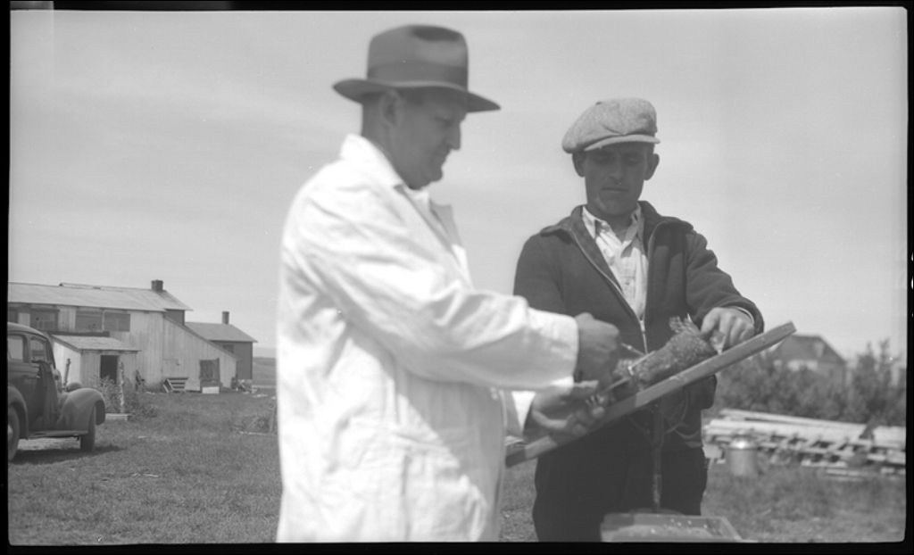 Démonstration de chaponnage à Saint-Michel-de-Bellechasse, 1946, Archives nationales à Québec, Fonds Ministère de la Culture et des Communications, (03Q,E6,S7,SS1,D2,P30788), François Fleury.