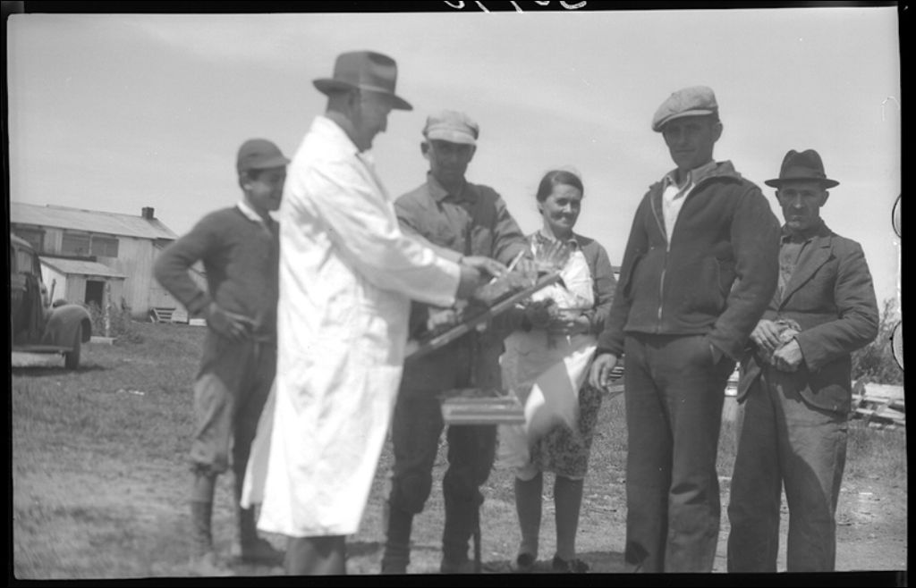Démonstration de chaponnage à Saint-Michel-de-Bellechasse, 1946, Archives nationales à Québec, Fonds Ministère de la Culture et des Communications, (03Q,E6,S7,SS1,D2,P30790), François Fleury.