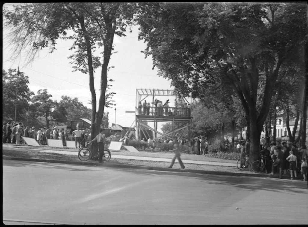 Tournage du film "13, rue Madeleine" à Québec, parc de l'Esplanade tranformé en ville française sous l'occupation allemande, 1946, Archives nationales à Québec, Fonds Ministère de la Culture et des Communications, (03Q,E6,S7,SS1,D2,P31937), Roland Charuest.