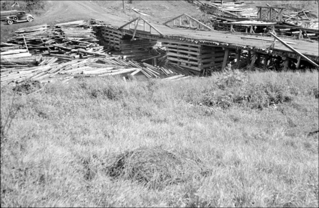 Pont sur la rivière Snellier dans le canton Laroche, comté de Rimouski, 1946, Archives nationales à Québec, Fonds Ministère de la Culture et des Communications, (03Q,E6,S7,SS1,D2,P33201), Philippe-Auguste Dupuis.