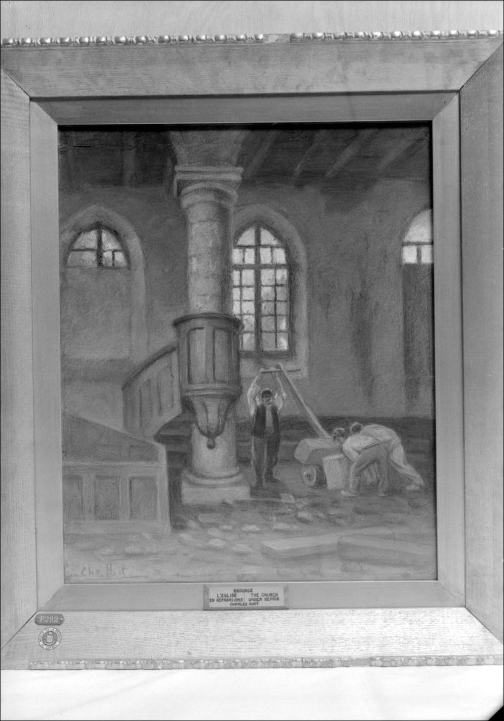 «Église de Brouage en réparation», peinture par Huot, 1947, Archives nationales à Québec, Fonds Ministère de la Culture et des Communications, (03Q,E6,S7,SS1,D2,P35539), Roland Charuest.