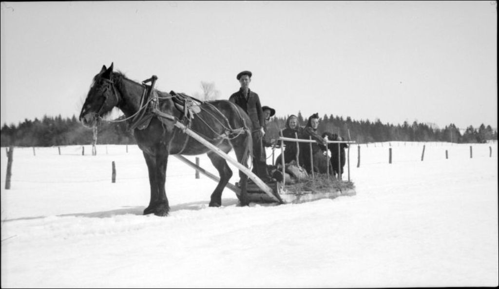 Promenade en traineau, partie de sucre à L'Ange-Gardien, comté de Québec, Mars 1947, Archives nationales à Québec, Fonds Ministère de la Culture et des Communications, (03Q,E6,S7,SS1,D2,P36534), Léopold Arcand.
