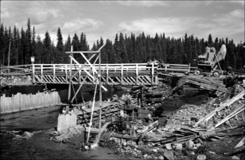Pont temporaire sur la rivière Jacques-Cartier, comté de Montmorency, 1947, Archives nationales à Québec, Fonds Ministère de la Culture et des Communications, (03Q,E6,S7,SS1,D2,P38439), Louis-Philippe Poudrier.
