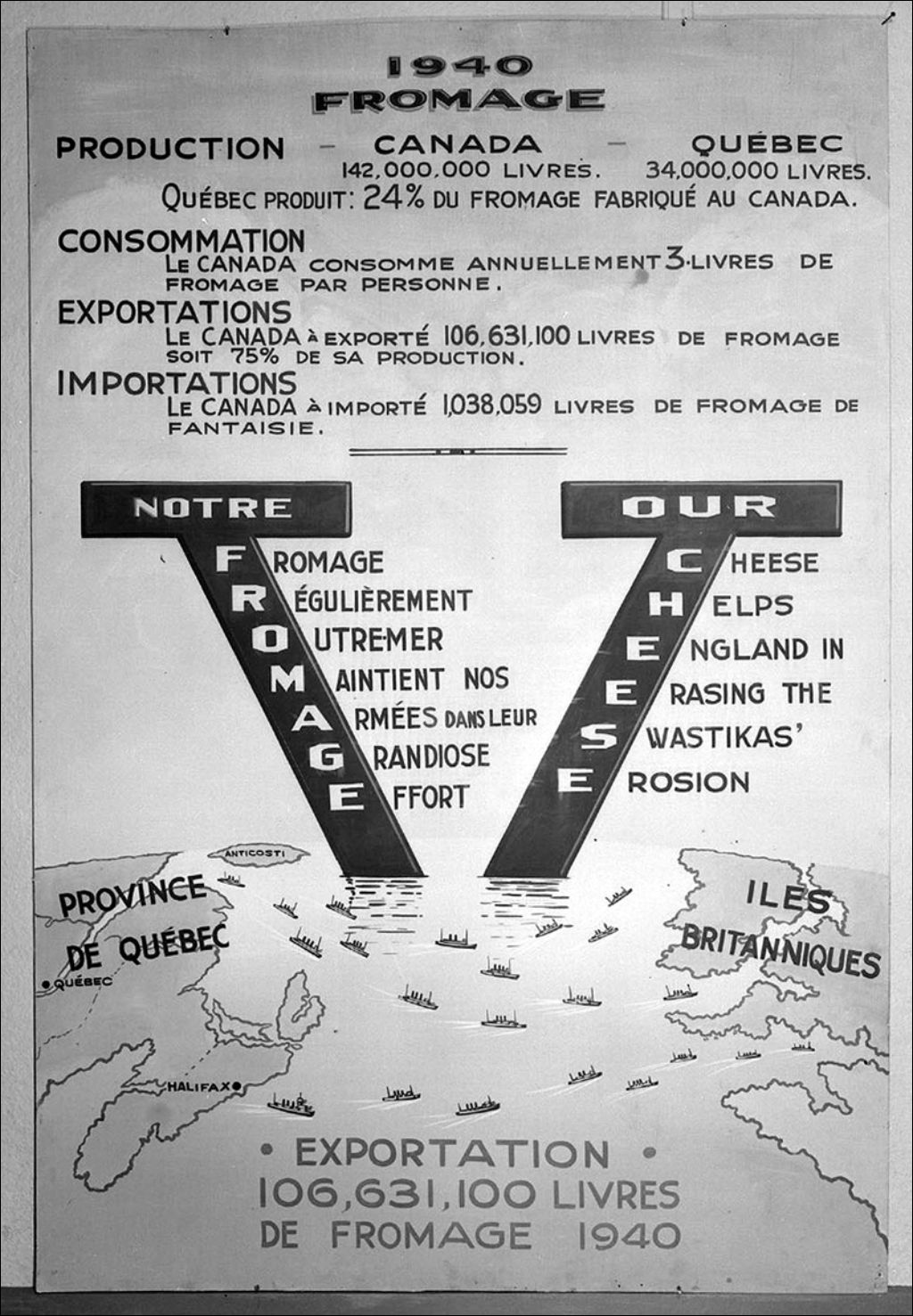Statistiques sur le fromage canadien et son importance pour la victoire outre-mer, datée de 1940, 1941, Archives nationales à Québec, Fonds Ministère de la Culture et des Communications, (03Q,E6,S7,SS1,D2,P4359), Raymond Audet.