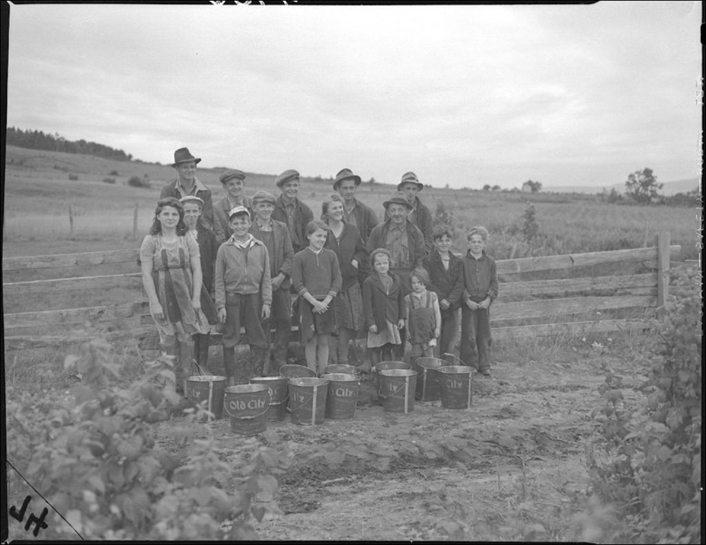 Cueillette des framboises à Saint-Laurent, île d'Orléans (famille de 21 enfants), 1942, Archives nationales à Québec, Fonds Ministère de la Culture et des Communications, (03Q,E6,S7,SS1,D2,P4755), Herménégilde Lavoie.