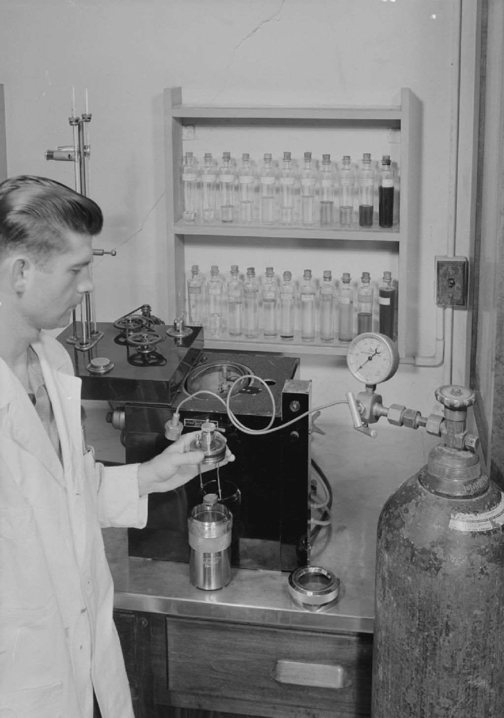Laboratoire de minéralogie: bombe calorimétriuge Parr, 1947, Archives nationales à Québec, Fonds Ministère de la Culture et des Communications, (03Q,E6,S7,SS1,D2,P61120), Neuville Bazin.