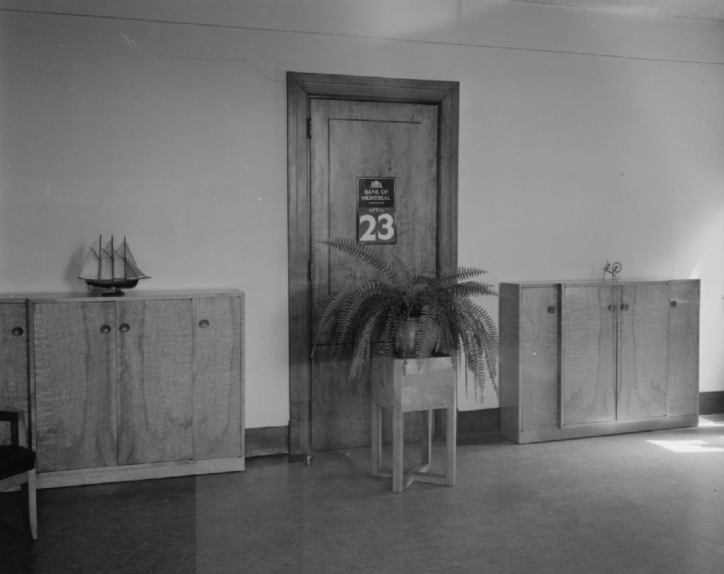 Ameublement conçu et fabriqué par Henri Beaulac, professeur à l'École du Meuble, 1948, Archives nationales à Québec, Fonds Ministère de la Culture et des Communications, (03Q,E6,S7,SS1,D2,P62436), Neuville Bazin.