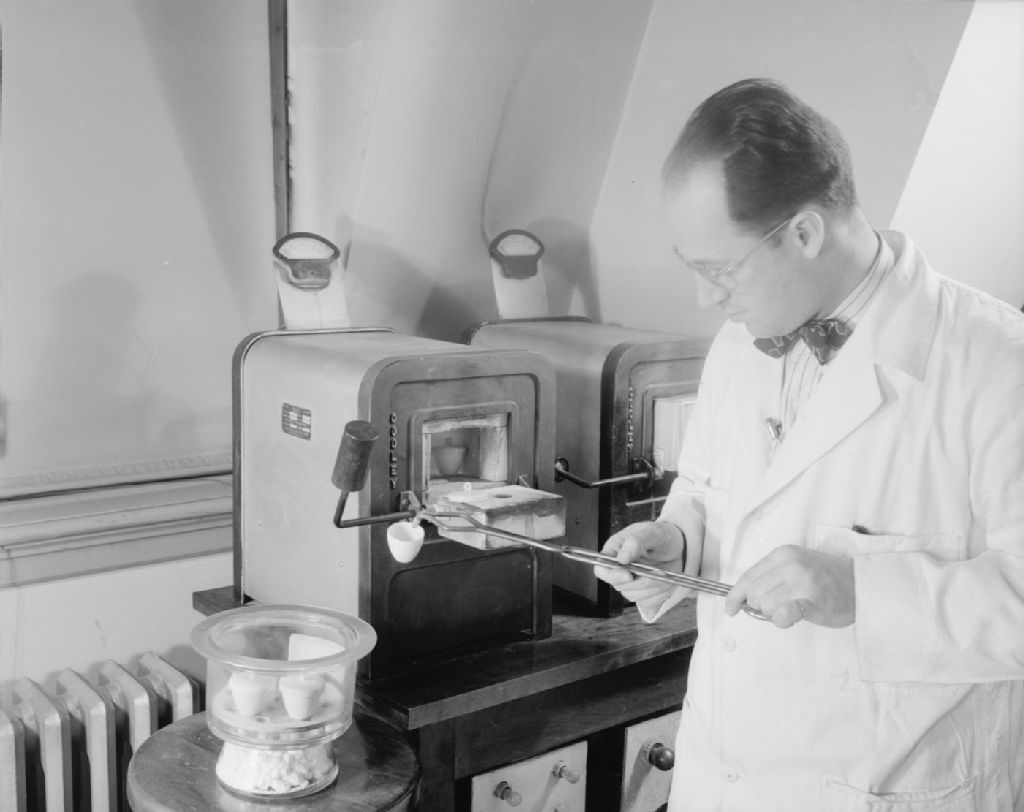 Laboratoire de minéralogie: calcination des précipités au creuset, 1947, Archives nationales à Québec, Fonds Ministère de la Culture et des Communications, (03Q,E6,S7,SS1,D2,P62722), Neuville Bazin.