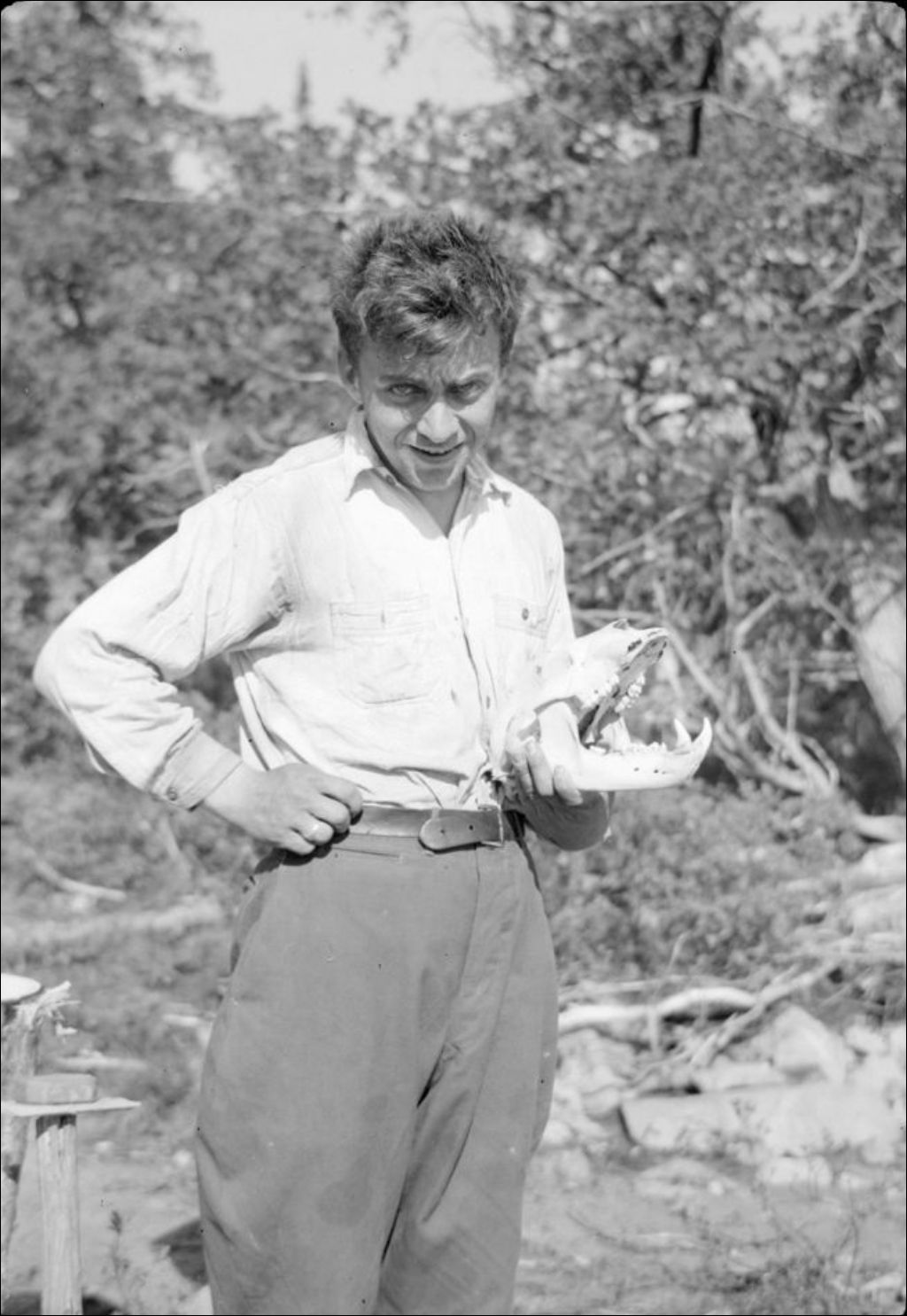 Claude Drouin tenant un crâne d'ours