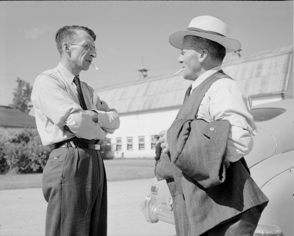 Le président (Marc Leclerc) et le secrétaire (Alexandre Fournier) de la Société des éleveurs de bovins canadiens à Deschambault, 1948, Archives nationales à Québec, Fonds Ministère de la Culture et des Communications, (03Q,E6,S7,SS1,D2,P65179), Omer Beaudoin.