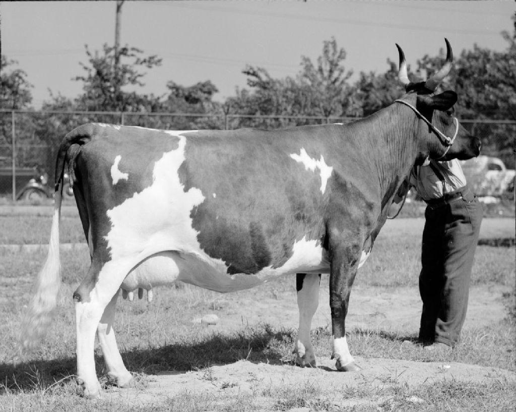 La grande championne Ayrshire à l'exposition de Trois-Rivières de 1948, Du portage Lima Superbe, de la ferme Bayonne à Berthierville, propriété de Azellus Lavallée, 1948, Archives nationales à Québec, Fonds Ministère de la Culture et des Communications, (03Q,E6,S7,SS1,D2,P65225), Omer Beaudoin.