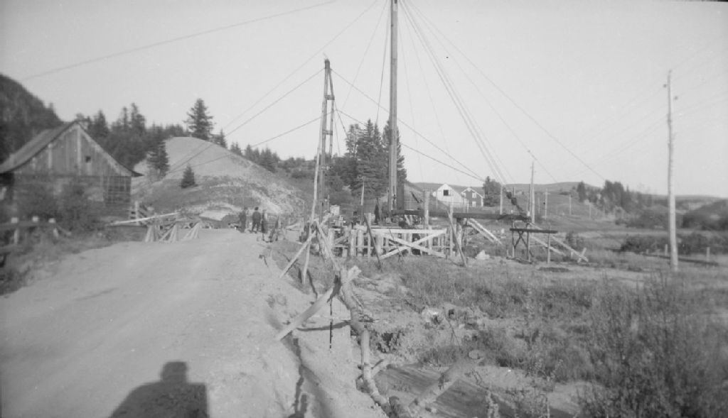 Enfoncement des pilots du pont Boivin sur la rivière à Beaude à Sacré-Coeur, route Tadoussac-Sacré-Coeur, comté de Saguenay, 1948, Archives nationales à Québec, Fonds Ministère de la Culture et des Communications, (03Q,E6,S7,SS1,D2,P65799), Jules Carbonneau.