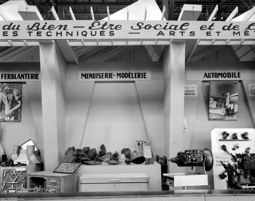 Kiosque sur la formation en menuiserie et modèlerie du ministère du Bien-Être Social et de la Jeunesse à l'exposition provinciale de Québec, 1948, Archives nationales à Québec, Fonds Ministère de la Culture et des Communications, (03Q,E6,S7,SS1,D2,P65949), Omer Beaudoin.