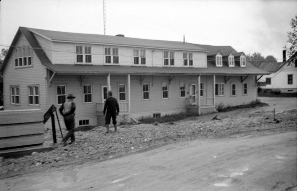 Bâtiment aux abords du pont Price sur la rivière Mistassini à Dolbeau, route 55, comté de Roberval, 1948, Archives nationales à Québec, Fonds Ministère de la Culture et des Communications, (03Q,E6,S7,SS1,D2,P66059), Camille Milot.