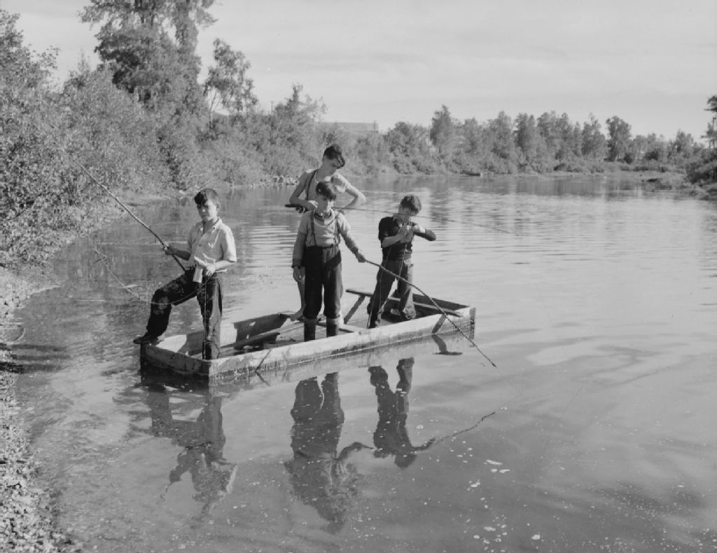 Jeunes pêcheurs à la ligne à Saint-Louis de Pintendre, comté de Lévis, 1948, Archives nationales à Québec, Fonds Ministère de la Culture et des Communications, (03Q,E6,S7,SS1,D2,P66467), J.W. Michaud.