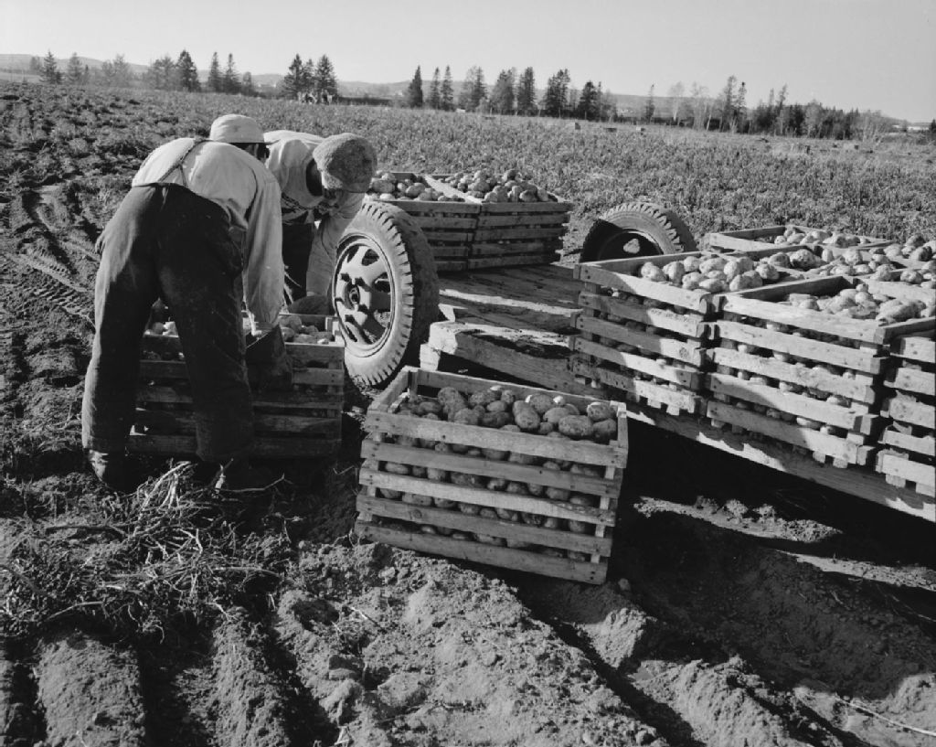 La mise en boîte des pommes de terre chez monsieur Rodolphe Gagnon à Saint-Ambroise de Chicoutimi, 1948, Archives nationales à Québec, Fonds Ministère de la Culture et des Communications, (03Q,E6,S7,SS1,D2,P66676), Omer Beaudoin.