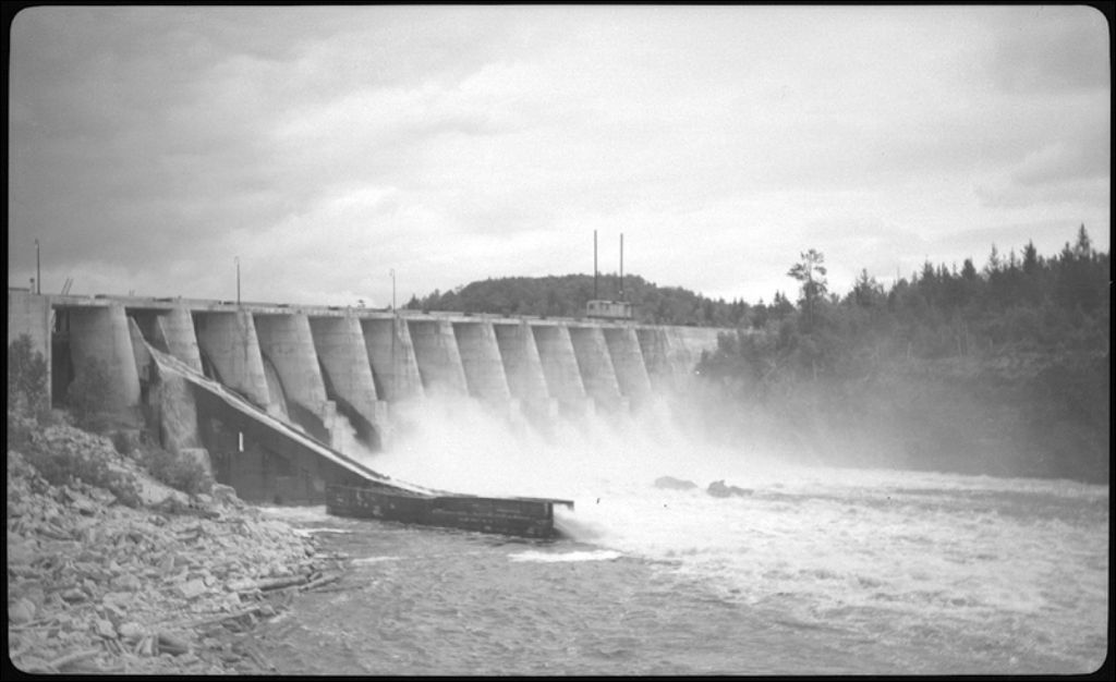 Barrage Bryson vu du glissoir à billots, rivière des Outaouais