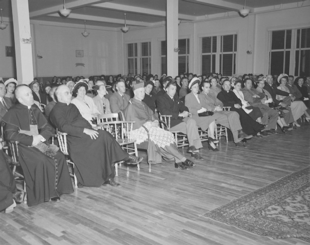 La foule et les invités d'honneur assis durant les allocutions qui ont suivi la bénédiction de l'école de l'endroit, Sainte-Anne-de-Portneuf, comté de Saguenay