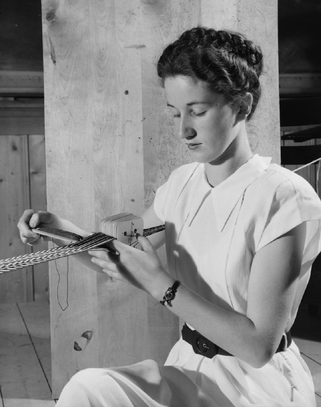 Gemma Ross Chandler tissant une ceinture égyptienne à Duchesnay., 1949, Archives nationales à Québec, Fonds Ministère de la Culture et des Communications, (03Q,E6,S7,SS1,D2,P70209), Omer Beaudoin.